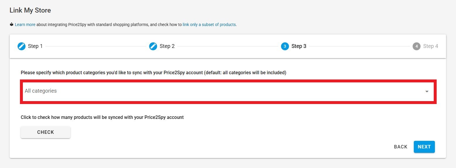 - It is necessary to select categories you would like to sync with your Price2Spy account as the default selection is All categories meaning all products will be included in the account.